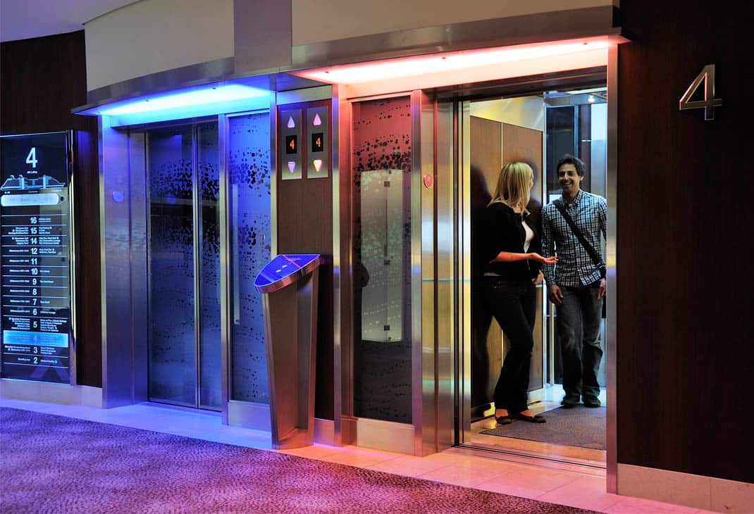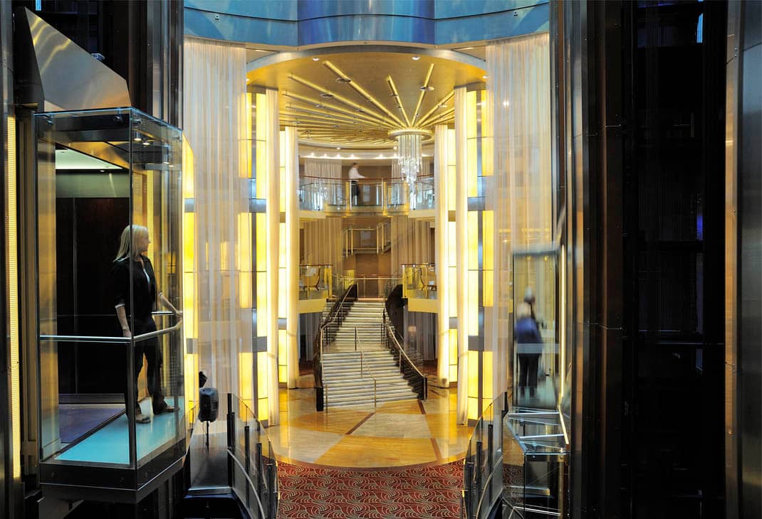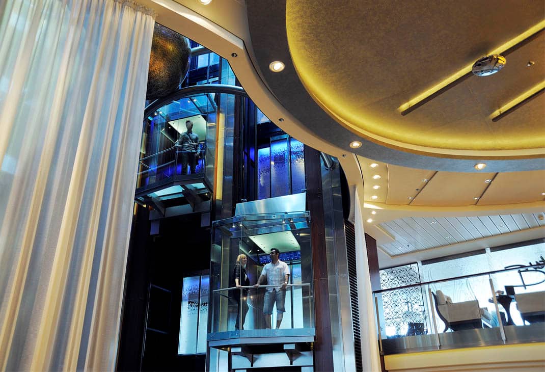 The Celebrity Eclipse, launched in 2010, is the third in a series of Solstice class ships in Royal Caribbean’s Celebrity Cruise fleet. The Solstice class boasts magnificent architecture and design combined with advanced technology. Scott Butler of Wilson Butler Architects designed the eight panoramic elevators to naturally serve the main vertical people flow function of the ship. He also designed the elevators to serve as miniature stages from which guests can see and be seen.