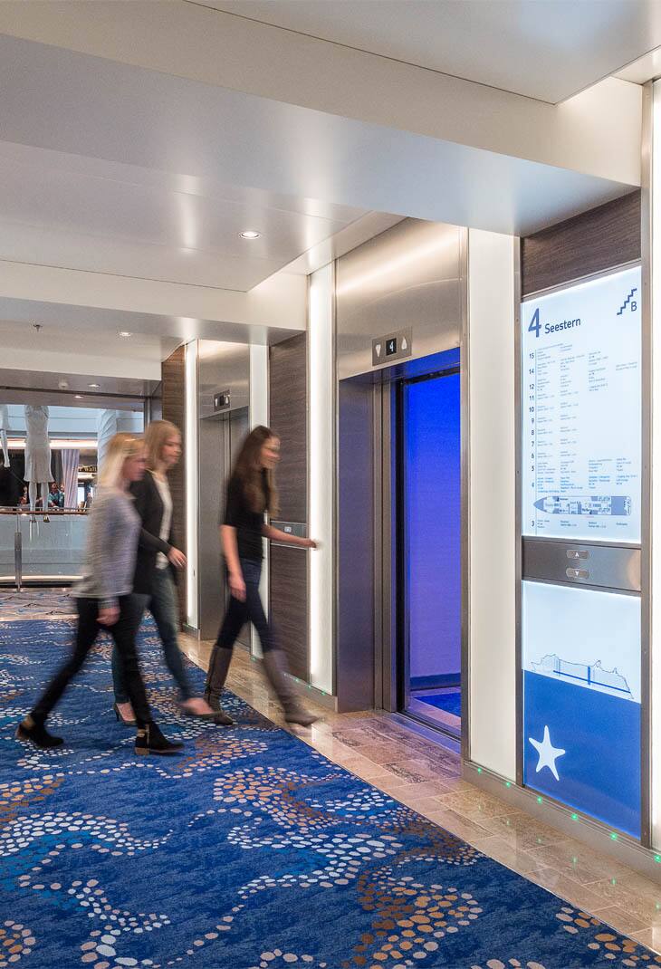 Working in close cooperation with both the owners and operators of the vessels, as well as with the Meyer Turku shipyard, KONE has designed and supplied a suitable people and goods flow solutions for the ships, consisting of different types of elevators, escalators and intelligent monitoring solutions.