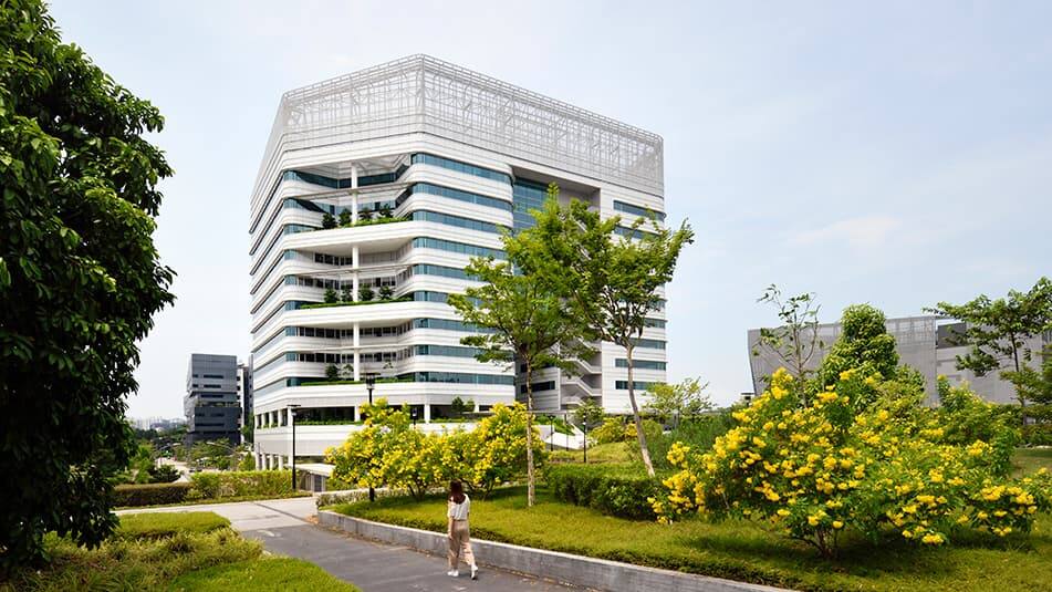 ALICE@Mediapolis is a shining example of an intelligent, environmentally conscious Singapore office building, with sky terraces on the third, sixth and ninth floors, and solar paneling on the roof.