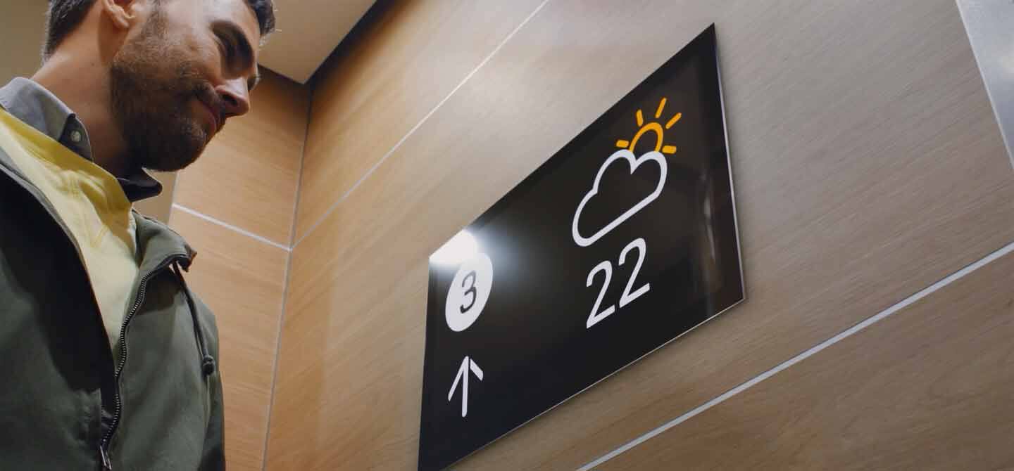 The KONE Information package is a tool for the community. It enables facility managers to send building-related information to residents' smartphones or the info screens in the elevators or lobby.