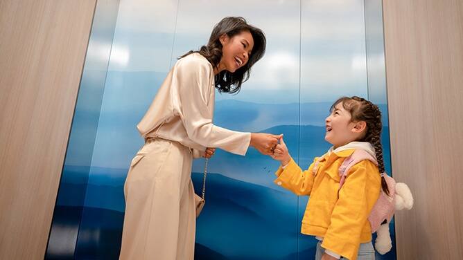 從資訊娛樂螢幕、到能夠投射媒體內容的魔術鏡子,通力 DX Class 升降機提供多元方式,為乘客提供資訊、娛樂和啟發。
